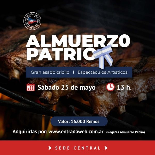 El próximo 25 de mayo a las 12:30 hs, el Club Mendoza de Regatas invita a toda su comunidad a participar del tradicional Almuerzo Patrio, que se realizará en el Sector Quinchos. Será una jornada especial para reencontrarnos con nuestras raíces y compartir nuestras costumbres más representativas.